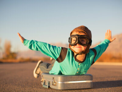 10793 | Young Boy with Goggles Imagines Flying on Suitcase | iStock_Rich Vintage | |
