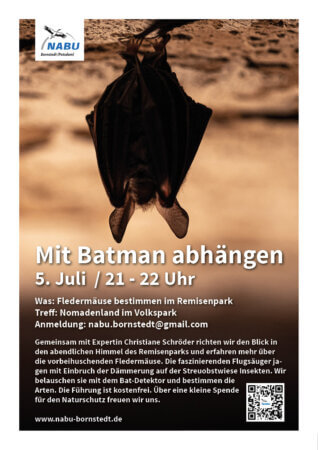 Gemeinsam mit Expertin Christiane Schröder richten wir den Blick in den abendlichen Himmel des Remisenparks und erfahren mehr über die vorbeihuschenden Fledermäuse. Die faszinierenden Flugsäuger jagen mit Einbruch der Dämmerung auf der Streuobstwiese Insekten. Wir belauschen sie mit dem Bat-Detektor und bestimmen die Arten.