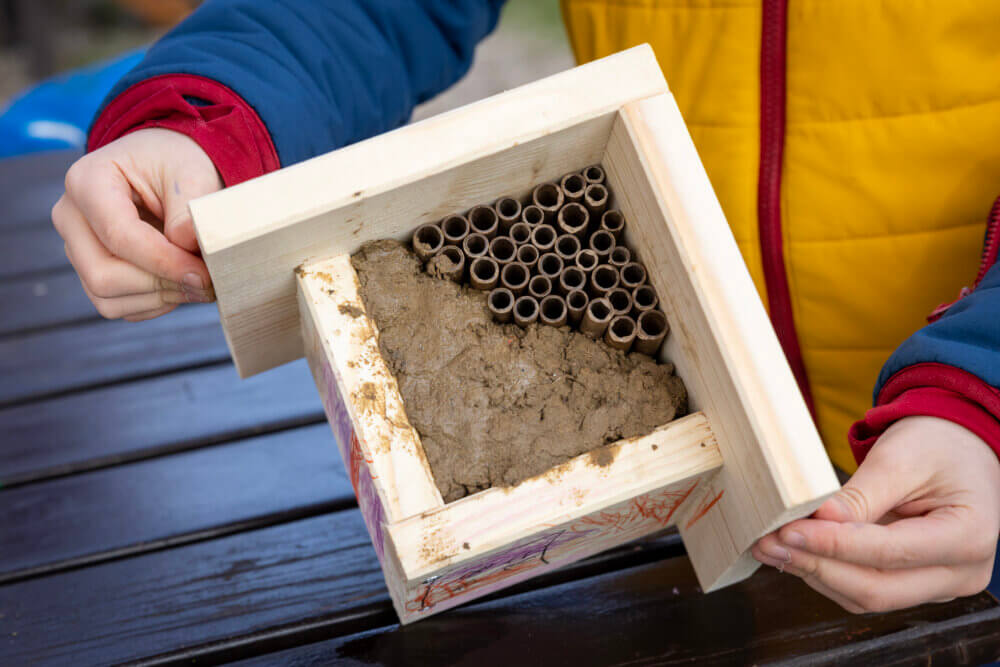 Mit dem NABU Bornstedt Insektenhotels bauen, bemalen und neue Lebensräume schaffen. Insektenhotels sind eine tolle Möglichkeit, Wildbienen aus der Nähe zu beobachten. Die Hotels könnt Ihr gegen eine selbst gewählte Spende mit nach Hause nehmen (Materialwert: 15 Euro pro Hotel). Kinder sind herzlich willkommen! Das passende Futter für Eure Wildbienen bieten